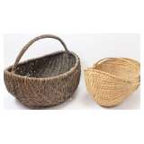 TWO LARGE OPEN NATIVE AMERICAN BASKETS Large oval open Native American basket with handle. 21" long, 15" high, 15" wide. Some material missing from handle and around rim. No signature. Large Native American buttocks basket with handle. Rim of basket features break, approximately 3" from handle 20 x 12 x 7". No signature. Size: N/A, Est. 25-100, Lot: 32137