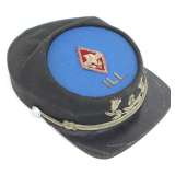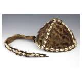 NATIVE AMERICAN CEREMONIAL MEDICINE HAT Wood interior structure lashed into a cone-like frame, over which an ocelot hide is stretched and decorated with cowrie shells. Extending down from the frame is a tail-like strip also sewn with cowrie shells. Size: 8" diameter, 5" tall, Est. 100-200, Lot: 32138
