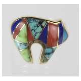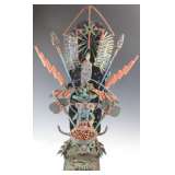 NATIVE AMERICAN METAL YARD ART Welded and painted Native American metal yard art. This piece features Native American symbols such as a buffalo head, two arrows, two tomahawks, an eagle and two lightning bolts. Size: 26x16", Est. 100-200, Lot: 32140