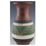 SIOUX POTTERY VASE Sioux Pottery vase. Done in brown tones with black, white, and green stripes. Has designs of an eagle, the word "Sioux" and various designs. Minor scuff marks. Size: 10 x 5", Est. 100-200, Lot: 32142
