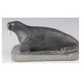 INUIT SOAPSTONE CARVING OF WALRUS WITH IVORY TUSKS Primitive carving of walrus made from soapstone, featuring tusks made of ivory. Size: 5 x 3.5 x 2" (with base), Est. 50-100, Lot: 32147
