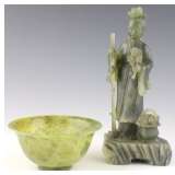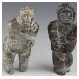 TWO INUIT STONE SCULPTURES ONE SIGNED The signed sculpture depicts a man in winter garb who appears to be tugging on his right sleeve. Signature is on bottom of feet. The other is older and was at one point holding an object mounted by wooden pegs in both hands, however they are no longer present. The latter's facial expression is one of anguish. Both sculptures show aging and cracks throughout. Size: 4", Est. 50-150, Lot: 32149