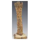 INUIT CARVED FOSSIL BONE OF EAGLES AND OWLS Carved fossilized animal bone in the form of a tree with eagles and owls. Affixed to a larger piece of polished bone. 10.5" including the base. Size: N/A, Est. 150-300, Lot: 32151