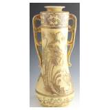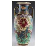SATSUMA VASE WITH FLORAL MOTIF Two-handled Satsuma earthenware vase with floral motif. Some loss of gold embellishment around the lip of the vase, crazing throughout the inside of the vase. Size: 15", Est. 50-100, Lot: 32170