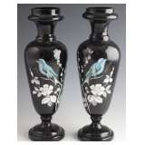 PAIR OF PURPLE JAPANESE HANDPAINTED GLASS VASES Hand painted with birds and flowers. Circa 1930s. Size: 10" tall, Est. 50-100, Lot: 32155