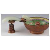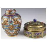 A CHINESE CLOISONNE GINGER JAR & LIDDED BRASS JAR A brass base ginger jar with cloisonne in relief. An enameled brass lidded jar with jade ovals to the lid. Size: up to 6" tall, Est. 40-80, Lot: 32164