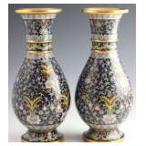 PAIR OF HIGHLY DECORATED CHINESE CLOISONNE VASES Early 20th century. Brass base with black background, decorated with brightly colored flowers. Size: 9" tall, Est. 50-100, Lot: 32166