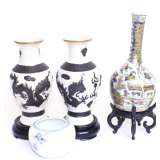 PAIR DRAGON VASES BRUSH WASHER & FAMILLE ROSE VASE Matching pair of dueling dragon vases. Both vases sit on wooden bases. Heavy crazing. A blue and white porcelain brush washer with a depiction of Buddha and a maker's mark on the bottom. Also a 19th Century Chinese export famille rose vase with hand painted rose motif, atop a wooden base, 1 prong of base is broken. Size: 5.5" w/o stand, 2", & 6" w/o base, Est. 50-150, Lot: 32168
