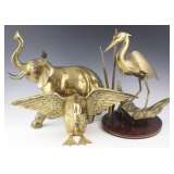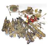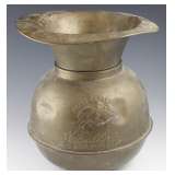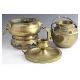 CHINESE BRASS CENSER & TEA POT & A CANDLE HOLDER Heavy brass incense burner with lion head handles. A brass tea pot (used). And a brass candle holder Size: candle holder 7" across, Est. 30-50, Lot: 32169