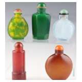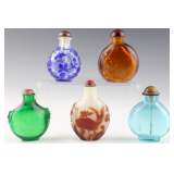 FIVE CHINESE SNUFF BOTTLES GLASS/PEKING GLASS Five various Chinese snuff bottles made from glass and Peking glass, ranging from 2.5 to 3" tall. Size: 2.5 - 3", Est. 100-300, Lot: 32171