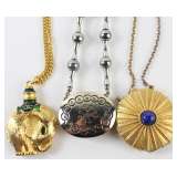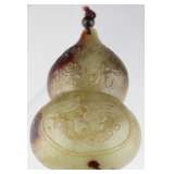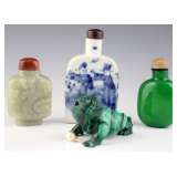FOUR CHINESE SNUFF BOTTLES - PORCELAIN STONE GLASS Four Chinese snuff bottles ranging from 2.5 - 3.75". Blue painted porcelain, glass, jade, and a malachite snuff bottle in the shape of a gecko (spoon is broken). Size: 2.5 - 3.75", Est. 100-300, Lot: 32172