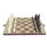 EARLY 20TH CENTURY CARVED BONE CHESS SET With some pieces standing 7" this set is from carved bone. One side is over painted in black. Together with a hand made chess board in leather covered wood. Size: N/A, Est. 100-200, Lot: 32177