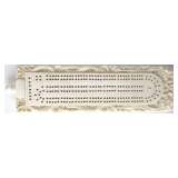 IVORY CRIBBAGE BOARD CARVED IN DRAGON MOTIF Small ivory double track cribbage board hand carved dragons along sides of the track. Comes with 4 small pegs all ivory one of which is painted red. Size: 7.4", Est. 150-300, Lot: 32179