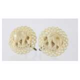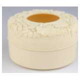 CARVED IVORY HAIR RECEIVER Carved ivory hair receiver, Victorian vessel used to store human hair for recycling,. Some cracking to rim of top, one crack to base. Size: 2.5" diameter, Est. 50-100, Lot: 32181
