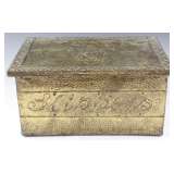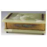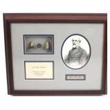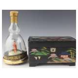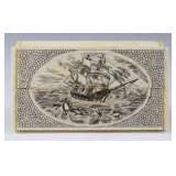 SIGNED NAVEL SCRIMSHAW BELT BUCKLE AND BOX Small scrimshaw hinged box made from many small pieces of whale bone. Inside the box is a plastic scrimshaw belt buckle both depict boats. Buckle signed "Boston Clipper 86" on the other side "Daniel Kiracofe", on the back it is signed again "Adair". Size: Box 4.25" Buckle 2.2", Est. 100-300, Lot: 32183
