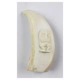 TIGER'S TOOTH CARVED WITH TIKI FIGURE Tiger's tooth carved with tiki figure. There are two wholes in the bottom of the tooth for stringing. Size: 3", Est. 100-200, Lot: 32185