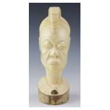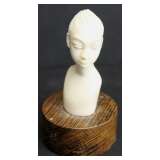 SMALL ELEPHANT IVORY AFRICAN CARVING A bust of an African Woman with braided hair. Fine detail to the face. The figure is fixed to a cylindrical wooden stand. Size: 4" tall, Est. 50-100, Lot: 32187