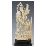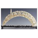 CHINESE CARVED ELEPHANT IVORY VILLAGE SCENE Carved elephant tusk fragment depicting a village scene including various figures, animals, buildings and even boats. Size: 6 3/4" including stand, Est. 150-300, Lot: 32192