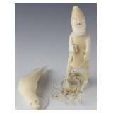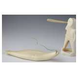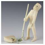 GREENLAND INUIT CARVED IVORY HUNTER FIGURE A carved native Inuit hunter with spear and a captured seal figure with broken string. Carved from whale's tooth. Size: 3.25", Est. 150-300, Lot: 32196