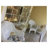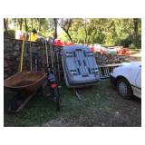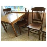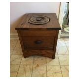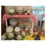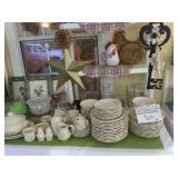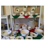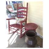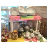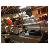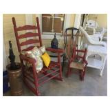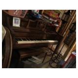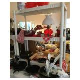 Furniture: Antique oak glass front cabinet with mustard buttermilk paint inside Oak twist leg pull out leaf dining room table Set of 5 arrow back plank bottom chairs Pair oak spindle back black leather bottom chairs 2 Baker’s racks Wood dry sink with Magnavox turntable, 8 track player, radio inside Mahogany drop leaf table with drawers at each end TV cabinet Sofa and matching chair Pair one drawer end tables Coffee table large drawer coffee table “to paint” Pair white wicker tables, round plant stand & pair wicker side tables 3 tall pine shelving units with adjustable shelves 2 white fold up wood shelves Bentwood caned rocker Vanity dresser with mirror Victorian arm chair King bedroom suit with bed, dresser, armoire 2 bookcases, office chair, piece of glass for floor mat Set of bunk beds Small round vintage pedestal table Depression era radio table long pine bench 2 pianos-one high back, one is a spinet Kohler & Campbell with bench Work table with metal legs Kindergarten 4 drawer table White Whirlpool washer & clothes dryer