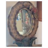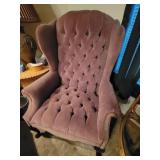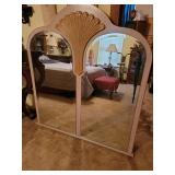 Upholstered bench Tufted velvet wingback chair Mid 20th Century McGuire Style Sheaf of Wheat Bamboo Dining Table base Vintage Philippe Starck Style Modern + Neoclassical Wall Mirror