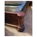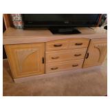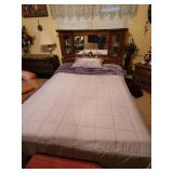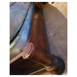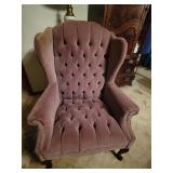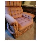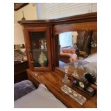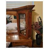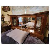Guest Bedroom Queen bed with mirrored headboard Hitachi 48" TV Vintage dresser with Mirror Pink Recliner Vintage Credenza Ornate Carved mahogany console table 5 drawer chest of drawers Vintage Exercise Bike