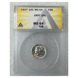 1937 Mercury Dime ANACS Professional Grade, MS 64 FSB