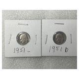 Two 1951 and 1951-D Roosevelt Dimes