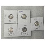 Five 1952 PDS Roosevelt Dimes