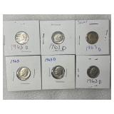 Six 1963 P&D Roosevelt Dimes