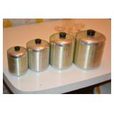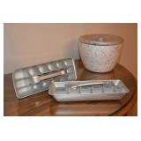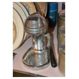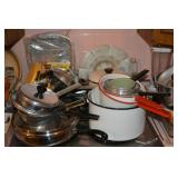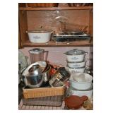Kitchen Assorted Pyrex kitchenware Assorted Corningware Assorted Pots and Pans Assorted glassware Vintage citrus juicer Vintage aluminum canister set Vintage Martini shaker Wooden salad bowl set Toaster oven George Foreman grill West Bend Popcorn Popper West Bend Slow Cooker Sunbeam hand mixer Vintage Jubilee percolator Roasting pans Vintage metal serving trays Pacman glasses