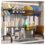 Over The Sink Dish Drying Rack, Adjustable (25.5 to 33.5 inch) 2 Tier Metal Steel Dish Drying Racks for Kitchen Counter with Hooks Paper Towel Utensil Cup Holder Sink Caddy, Brown
