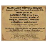 HUGE AUCTION! - SAT Nov. 21st @ 5 PM LAWRENCE COUNTY FAIRGROUNDS IN PROCTORVILLE. **CONSIGNMENT AUCTION HOUSE** Doors open at 4 pm for preview and bidder registration. We have a great selection of PRIMITIVES, ANTIQUES, FURNITURE, GLASSWARE, LONGABERGER, COINS, JEWELRY, COLLECTIBLES, TOOLS, BOX LOTS, AND MUCH MORE! We strive to offer you one of the best selections found anywhere in a clean, friendly atmosphere with good seating and helpful staff. FREE ADMISSION...FREE FUN...FREE ENTERTAINMENT. We look forward to seeing you at Marshall's Auction Service in Proctorville, Ohio at the Lawrence County Fairgrounds (Jonas Payne Building) every Saturday at 5 pm. We are your full service auction with plenty of parking and a "Health Department Certified" concession. CONSIGNORS WANTED!! We accept good, clean consignments on Mondays from 1:00 pm to 6:00 pm or call to make an appointment for a time that works best for you. We also buy full or partial estates and households. Call 304-633-6447 for more information. We accept absentee bids...if there is something listed that you are interested in but can't make it to the sale, call 304-633-6447 to place your absentee bid. Not responsible for accidents, injury, or loss of property while attending auction. Everything sold as is, where is, with no guarantees. NO BUYER'S PREMIUM. WE ACCEPT CASH OR CHECK WITH ID. Bob Sells, Auctioneer - License #57199875379 Jeff Bennett, Auctioneer - License #2013000174 Marshall Daniels, Auction Firm Manager - License #2012000172 |
