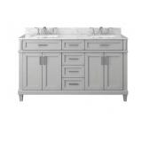 Talmore 60 in. Double Vanity in sky gray brings a clean and contemporary feel to any large bathroom space. The vanity offers a marble top, back splash and 2-rectangle basins that is both durable and easy to clean. Furthermore, this vanity is built with 2-tip out drawers, 4-soft-closing dovetail drawers and two levels of open shelf area that provides spacious and versatile storage space for the user. With its modern look and accomplished functionality, this vanity is the utmost combination between utility and style.