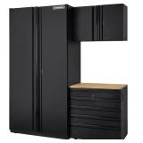 - Cabinet set includes: one multi-use locker, one wall cabinet and one five-drawer base cabinet