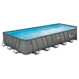 - Water Capacity: 8,393 gallons; Pattern: Dark gray wicker; Dimensions: 24 feet x 12 feet x 52 inches