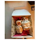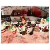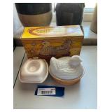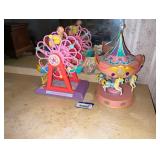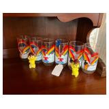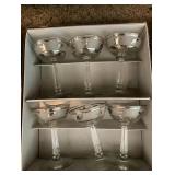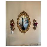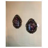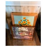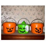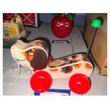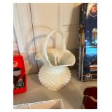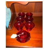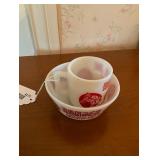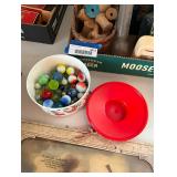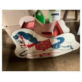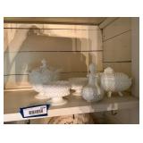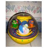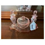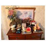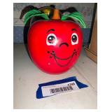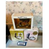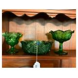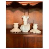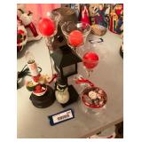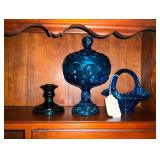 Blown glass console set: footed bowl w/ faux fruit and pair candleholders w/ globes