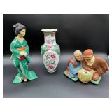 - Lot #19 - Vintage Asian Hakata Urasaki Ceramic Figurines & Painted "Galley" Vase