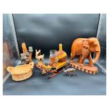 - Lot #23 - Vintage Wood Elephant, Small Metal Deer, Ceramic Owls on Tree, Small Sled, Leather Wrapped Decanter Bottle & More