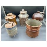 - Lot #28 - Antique Copper Cauldrons, Metal Cans & Large Crock Jug