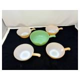 - Lot #59 - Vintage Fire Kin Peach Luster Beehive Soup Bowls, Vintage Fire Kin Jadeite One Spout Skillet