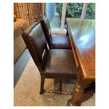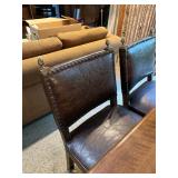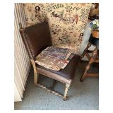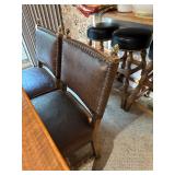 - Four English Jacobean-Style Leather Upholstered Dining Side Chairs, Brass Nail Head Trim, 36”H,
