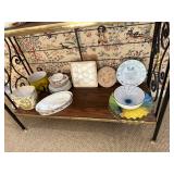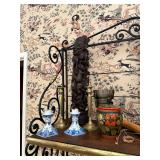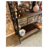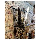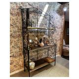 - Wrought Iron And Brass Mounted Baker’s Rack, having three stained hardwood shelves, 82” x 45” x 18”