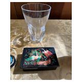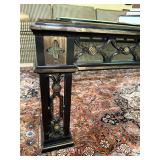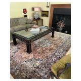 - Asian-Style Black Lacquered Beveled Glass-Inset Rectangular Coffee Table, Gilt Enhanced, 17” X 61” X 32”