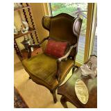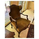 - Pair Of French Provincial-Style Brushed Velvet Upholstered Semi-Wing Armchairs; Having A Walnut Volute Carved Frame, 39”H,
