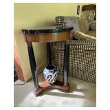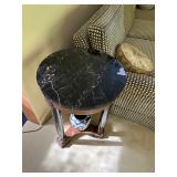 - Empire-Style Italian Black Marble-Top Fruitwood Side Table, Raised On Ebonized Columnar Legs On Tripartite Plinth, Brass Capitals, 25”H X 16”Diam.