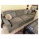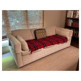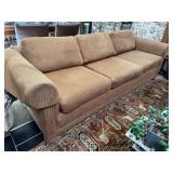 - Traditional Three Cushion Sofa With Scrolled Arms, Light Brown Tweed Upholstery, 96”L