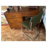 - Drexel walnut single-pedestal campaign desk, 30” x 46” x 18”