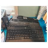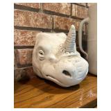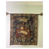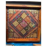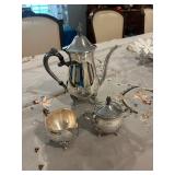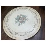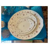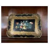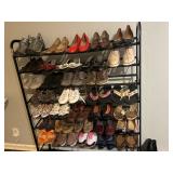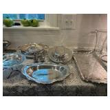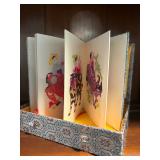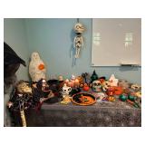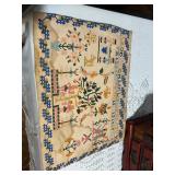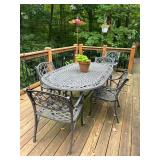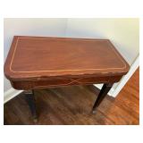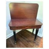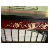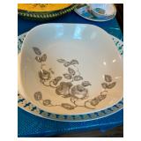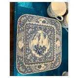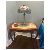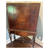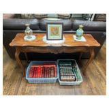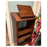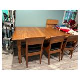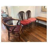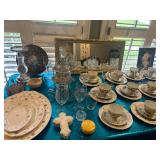 Dining room furniture including dining table with extra leaf & eight chairs, china cabinet with open hutch, decorative antique cabinet, bakers rack, antique writing table with tapestry top