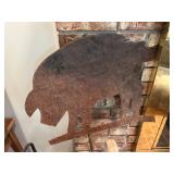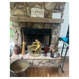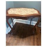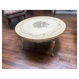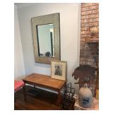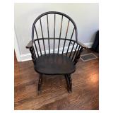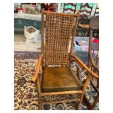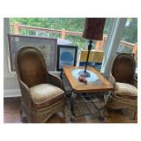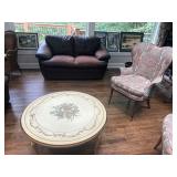 Living room furniture including leather couch & loveseat, vintage table with brass feet, two Haywood Wakefield chairs c. 1920's, end table, rocking chair, Ethan Allen console table, 3-shelf display stand